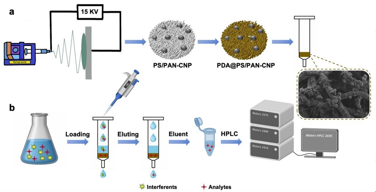 近年来,新兴的静电纺纳米纤维具有比表面积大、孔隙率高、孔径小等特点,作为固相吸附剂在吸附效率、解析性能以及净化杂质、浓缩目标物等方面表现出了优异的效果。本研究通过简便易行的静电纺丝技术制备了复合的聚苯乙烯/聚丙烯腈与碳纳米粉末的共混纺纳米纤维,并采用多巴胺自聚合手段对材料表面进行了功能化修饰,获得了一种新型功能化纳米纤维膜PDA@PS/PAN-CNP NFM。将PDA@PS/PAN-CNP NFM作为填充剂并形成萃取小柱,实现了基于纳米纤维的固相萃取技术(Packed-fiber solid-phase extraction, PFSPE)对多种霉菌毒素表现出优异的萃取性能。结合配备荧光检测器的高效液相色谱(HPLC-FLD),开发了一种灵敏、快速的玉米、竹笋、高粱及其衍生物中痕量霉菌毒素的检测方法。并对影响PFSPE效率的关键因素的,包括样品溶液的pH值、盐离子的类型和浓度、洗脱液的类型和体积、纳米纤维的用量和提取时间等进行了因素优化。该方法表现出良好的线性度、回收率(91.84%–99.12%)、精密度(RSD<6%)和低检出限(0.06–4.46μg/kg)。更引人注意的是,我们对制备的萃取柱进行了重复使用实验,结果表明可以重复使用25次以上。而且在纳米纤维对真菌毒素的吸附机制研究上,首次采用了分子动力学模拟方法进一步在分子作用力水平探究了不同材料对目标物的吸附性能差异,为针对不同目标物的预测和优选吸附剂提供了理论参考从而有望减少实验次数。